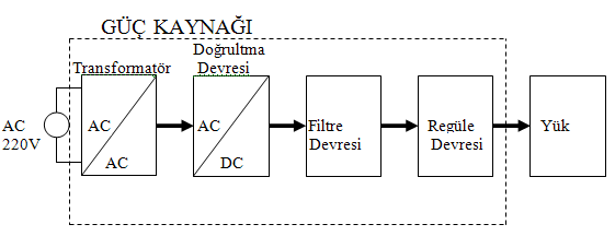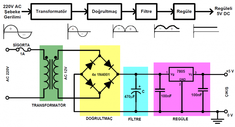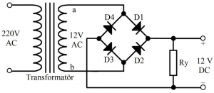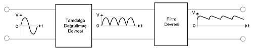 Şebeke gerilimi trafo girişine bağlanır. Trafo primer ve sekonder sargıları ile çıkışında gerilimi düşürür. Çıkışında dört adet diyotla ile tam dalga doğrultma sinyali ile dc bir gerilim elde edilmiş olur.