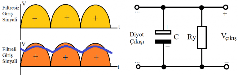 Doğrultma devresinin çıkışına paralel bağlı olan kondansatör, çıkış sinyalini filtre ederek düzgünleştirir. Şekil de görüldüğü gibi diyottan geçen pozitif alternans maksimum değere doğru yükselirken kondansatör şarj olur. Alternans sıfır (0) değerine doğru inerken ise, C, üzerindeki yükü (akımı) alıcıya (Ry) verir. Dolayısıyla alıcıdan geçen doğru akımın biçimi daha düzgün olur.