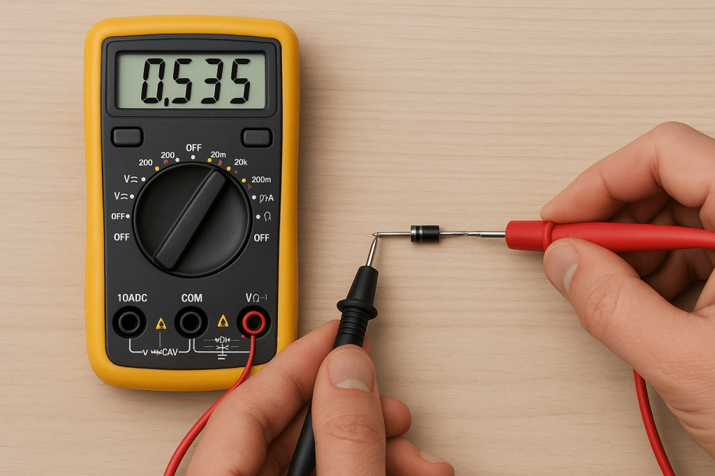 Kırmızı probu diyotun anot (pozitif) ucuna, Siyah probu diyotun katot (negatif) ucuna dokundurun. Genellikle diyotun katot tarafında bir çizgi olur. Sağlam bir silikon diyotta 0.5V – 0.7V arasında bir iletim gerilimi (voltaj düşümü) görürsünüz.