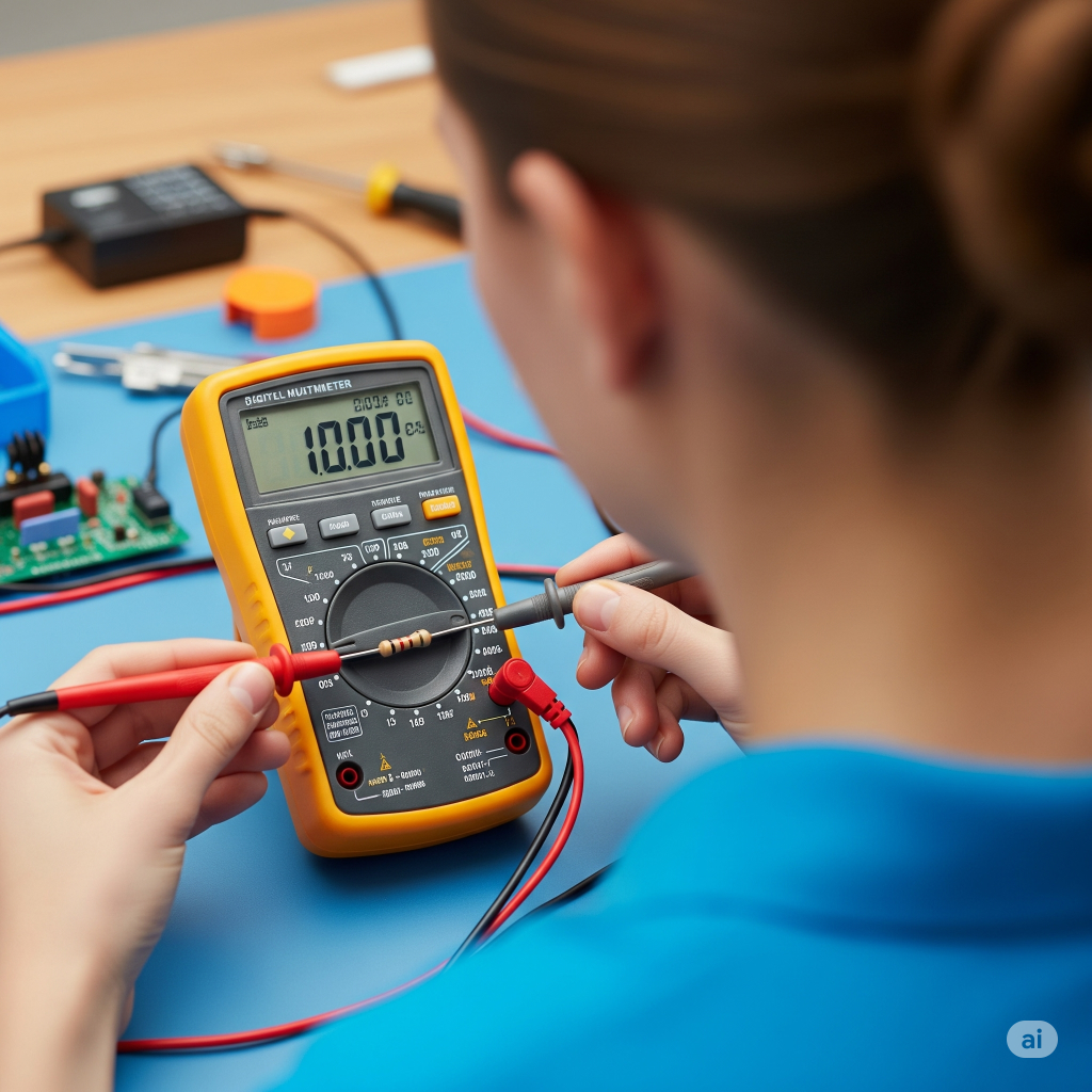 Siyah probu “COM” girişine, kırmızı probu “VΩmA” veya “Ω” girişine takın. Multimetre kadranını direnç ölçüm moduna (Ω) getirin. Manuel multimetre kullanıyorsanız, direncin beklenen değerinden daha yüksek bir aralık seçin. Direnci ölçün: Probları direncin iki ucuna sıkıca değdirin ve multimetre ekranındaki değeri okuyun. Sağlamlık kontrolü: Okuduğunuz değeri, direncin üzerindeki renk kodlarından veya yazılı değerden elde ettiğiniz beklenen değerle (tolerans aralığı içinde) karşılaştırın.